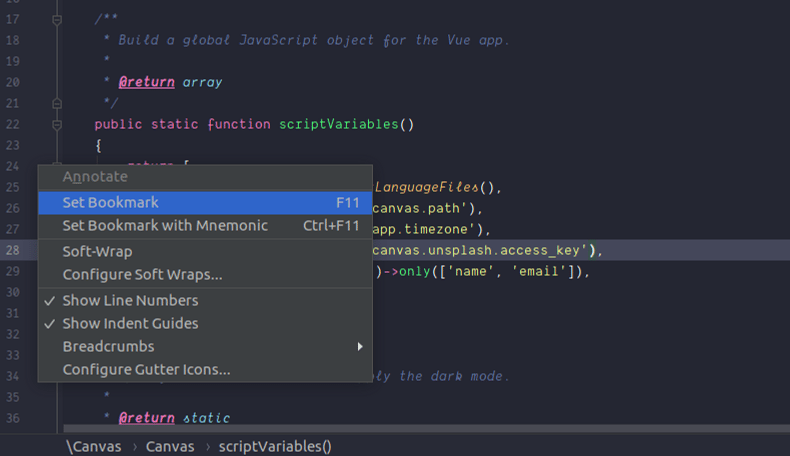 Basically, the bookmarks feature of PhpStorm works just like any other bookmarks we see elsewhere. i.e It saves an index to something and give user an easy access to that index. So, we can get to that in matter of few clicks. Using bookmarks, you can mark the lines you need to remember and easily jump from one to another.