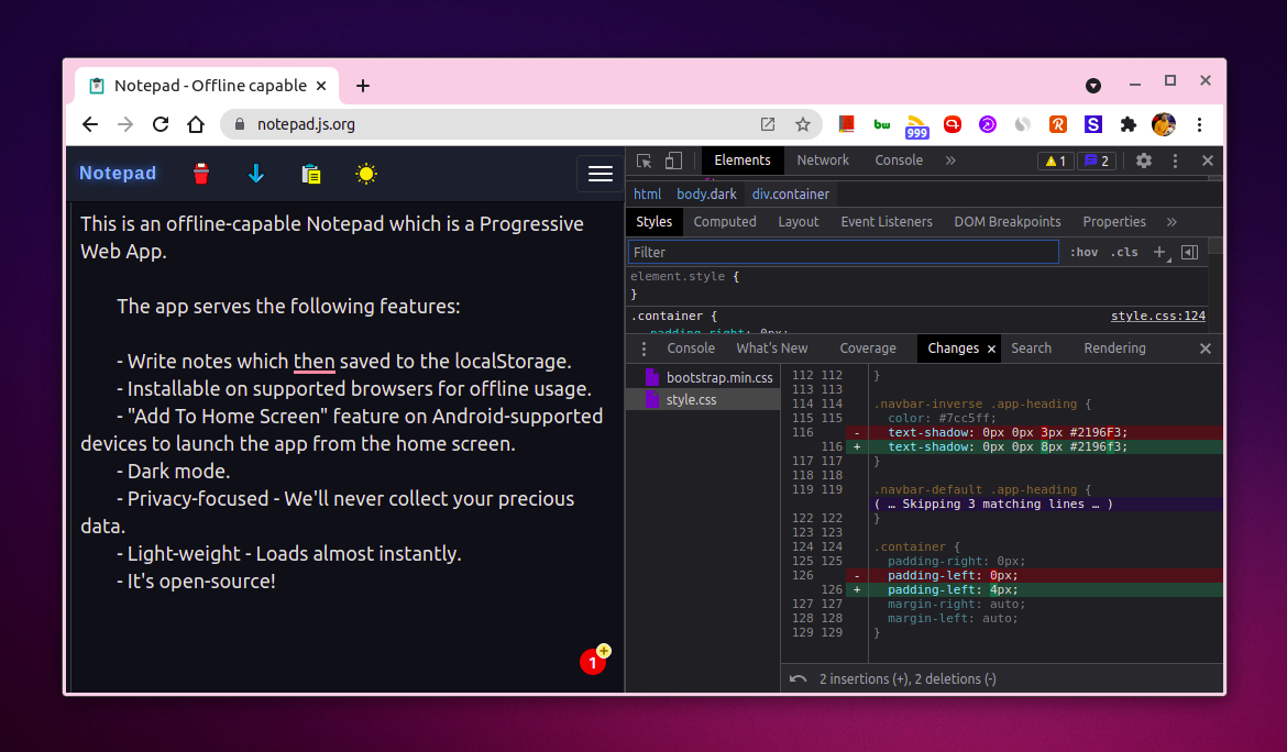 Once done, it will enable a new tab called “Changes” that will show you all the changes you made in the Dev Tools in the Git-style differences like so.